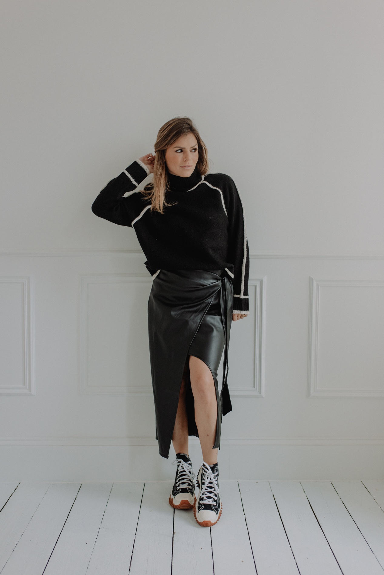 Leuke, warme pull met col en afboording in ecru.